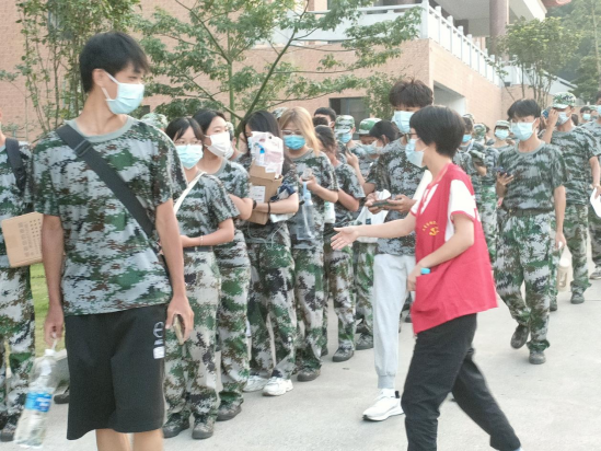 在核酸现场,身穿红马甲的志愿者们在烈日下维持秩序、协助医护人员,组织同学们打开粤核酸二维码,不耽误一分一毫,即使顶着酷暑,志愿者们仍以饱满的热情,奋战在疫情防控的一线中。