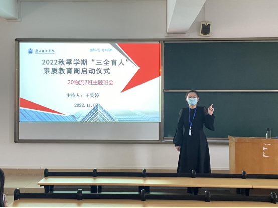 康松龄老师对“三全育人”素质教育周进行了详细的解读。她向全体学生说明了十一周教育活动的相关要求,强调在“三全育人”素质教育周主题教育活动中,要遵守纪律,不缺席任何一场活动,做好考勤工作,积极参与班级的集体活动。同时鼓励学生积极参与文体活动,从而提高学生自身的表达能力和心理素质。