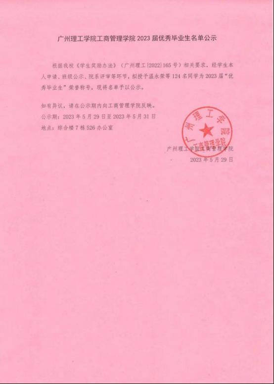 根据我校《学生奖励办法》(广州理工{2022}165号)相关要求,经学生本人申请、班级公示、院系评审等环节,拟授予温永荣等124名同学为2023届“优秀毕业生”荣誉称号,现将名单予以公示。