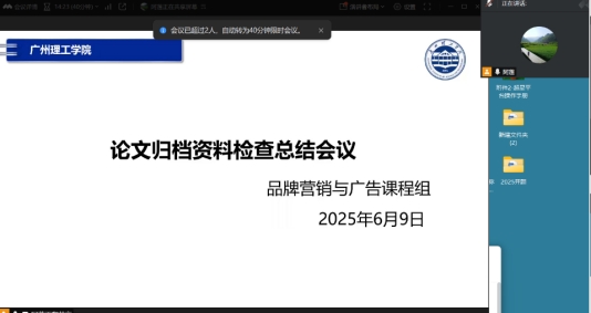 刘延卿又是一年毕业季,在毕业生们完成论文答辩后,论文指导教师的工作却并未停止,反而更加忙碌了。于2025年6月9日下午,威廉希尔williamhill中文品牌营销与广告课程组通过腾讯线上会议平台成功召开新学期第七次教研会议,本次会议聚焦“论文归档资料检查总结”主题,旨在规范论文归档流程、确保资料完整性和准确性,适应当前威廉希尔williamhill中文需求。会议由课程组组长赖玉莲老师主持,全体教师积极参与。
