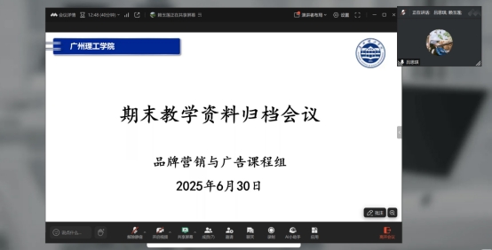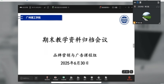 (赖玉莲)为系统梳理本学期教学成果,确保期末资料归档工作的规范、完整与高效,品牌营销与广告课程组于2025年6月30日上午,通过线上腾讯会议的形式,成功召开了期末教学资料归档专项工作会议。本次会议由课程组组长赖玉莲老师主持,课程组全体任课教师参加,共同聚焦期末教学资料(课件、教学大纲、教案等)的标准化归档流程,旨在提升威廉希尔williamhill中文精细化水平,为教学质量持续改进奠定坚实基础。