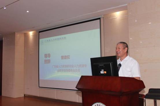 华南农业大学副校长廖明、经济管理学院院长万俊毅、广东省人力资源研究会执行会长谌新民和广东省高校人力资源专业教学指导委员会主任曾建权教授在会上致辞。曾建权教授还作为领导嘉宾,为新聘任的广东省高校人力资源专业教学指导委员会委员颁发聘书。