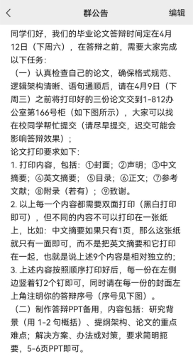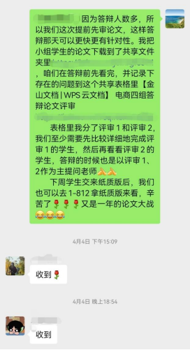 本届毕业论文正值本科评估关键时期,因此对论文质量要求都比较高,今年的答辩时间也较往年提前了一个月,以确保后续有足够时间进行论文的修改完善。为确保4月12日下周六现场答辩的顺利进行,小组老师们将相关论文答辩要求在答辩小组群中进行群公告,要求学生提交格式规范、逻辑架构清晰、语句通顺的纸质版论文,同时准备答辩PPT备用。