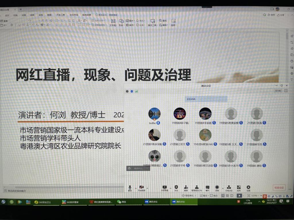 其中一场是由著名营销专家、市场营销专业学科带头人、市场营销国家级一流本科专业建设点负责人何浏教授,应邀为我校市场营销专业同学带来以《网红直播,现象、问题及治理》为主题的在线讲座。何浏教授一直都十分关注营销发展前言,在数字营销领域研究颇深。本次讲座的主题也紧贴当前热点,深入浅出的讲解和探讨了数字营销发展中业界、学术界都特别关注的网红直播现象及相关问题的治理,为我校营销专业的学生奉献了一场精彩的线上演讲。