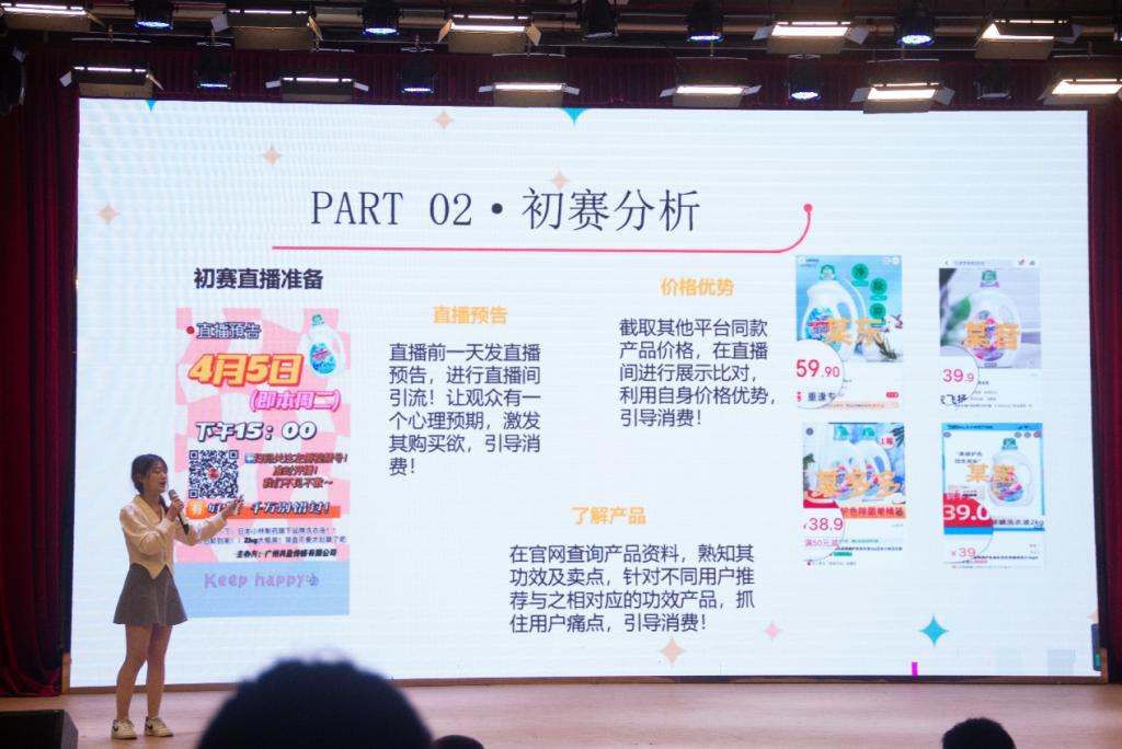 在比赛现场,选手们使出仪态端庄、语言流畅,用激昂的语调为观众们详细介绍了他们的团队以及直播带货的过程,包括直播前中后所需要的的准备以及注意事项,还分享了直播的一些小技巧,例如要有丰富的动作表情以及树立自己独特的风格,针对顾客的需求疑问进行详细的解答。同时,他们也分享了自己在这场比赛中所收获的成果以及总结了比赛以来的自身存在的不足之处,力求在下次比赛中吸取经验,更获佳绩。