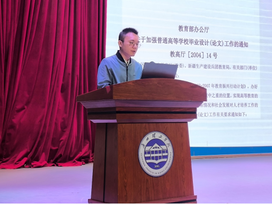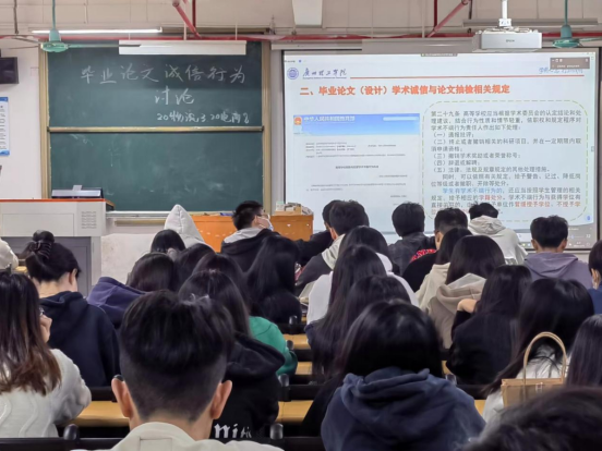 首先,许锐埼老师向同学们讲述毕业论文造假的危害,会影响同学们自身的前途。其次,许锐埼老师讲解了什么是毕业论文,以及讲述毕业论文作假的处理方式,告诫各位同学诚信做人,坚持良好品行。最后,他对如何写好毕业论文,如何完成毕业论文展开讲述,并告诫同学们要实事求是、坚守真实诚信底线,做到高质量的完成毕业论文。