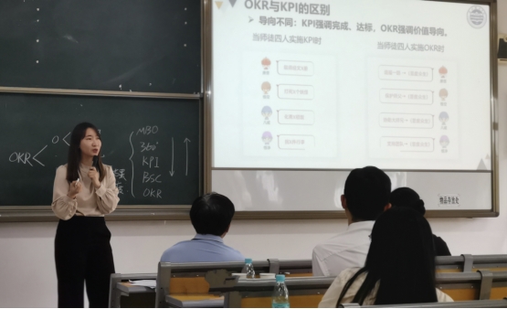 之后,张旭老师现场演示第10章第2节OKR目标与关键成果部分的课堂讲解。此部分的内容比较晦涩难懂,逻辑性较强,对学生的集中力要求较高。张老师的教学用语生动有趣、灵活多变。创设了情境让学生互相学习、交流。张老师分享道:“在一个生动活泼的课堂环境中,学生更容易被吸引,更积极地参与,更容易掌握知识。”