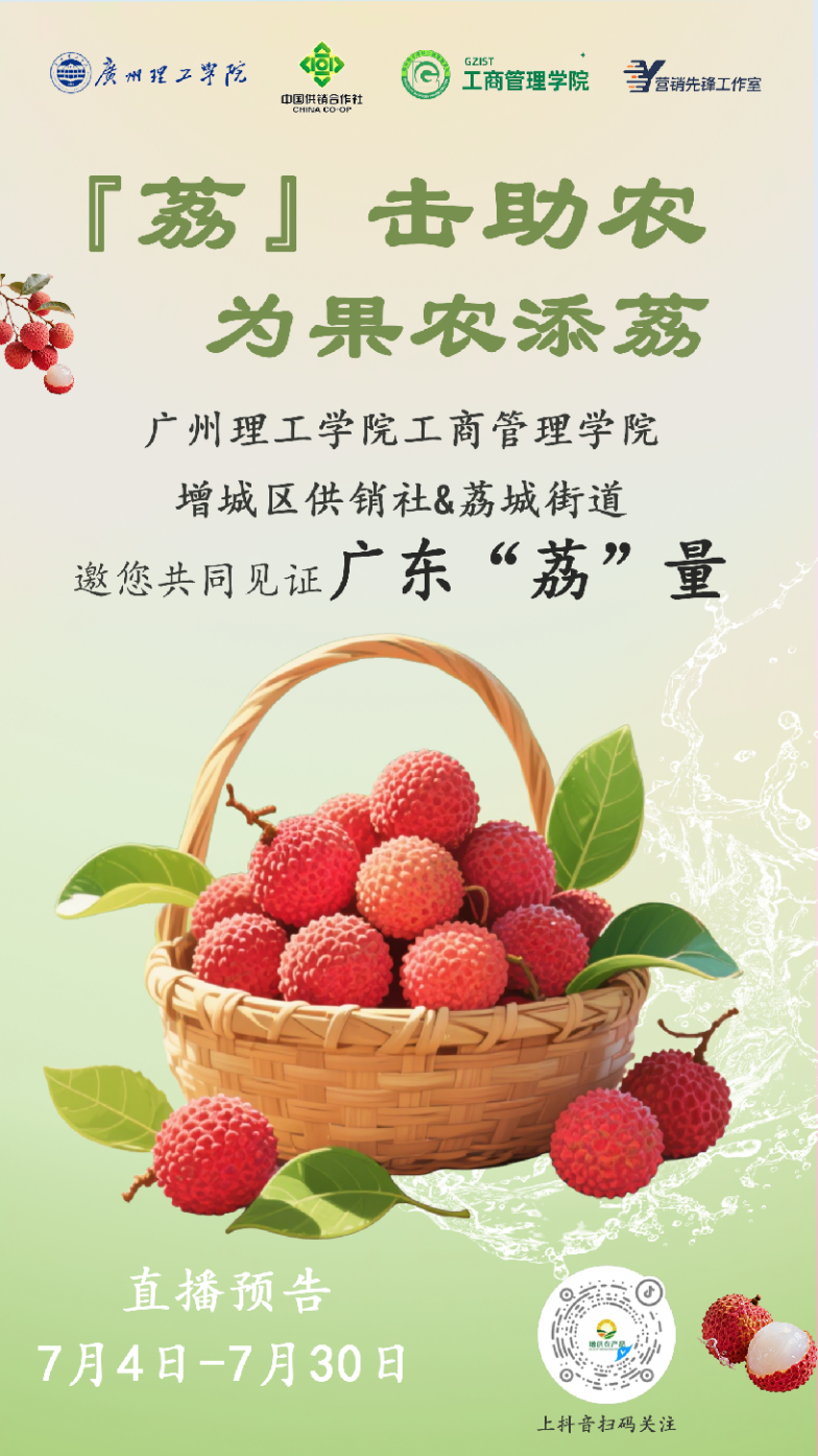 威廉希尔williamhill中文,威廉希尔williamhill中文营销先锋工作室“三下乡”团队将在指导老师宋旸、曹瑞溪的带领下,于7月2日至7月30日期间,深入荔枝果园、分装车间,通过增供农产品公司官方账号,开启助农电商直播。岭南荔枝的香甜、“三下乡”学生们的热情,将跨越屏幕与你“不见不散”!