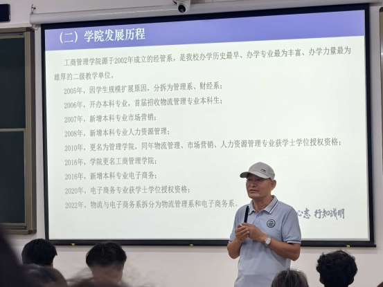 “咱们学院的根基,要追溯到2002年成立的经管系,”他缓缓开口,声音里带着对过往的珍视,“作为学校办学历史最早、专业体系最丰富、师资力量最雄厚的二级教学单位,这些年咱们一步一个脚印地成长——从最初的几个专业,慢慢拓展新方向;从默默耕耘,到如今收获一项项亮眼荣誉。”他顿了顿,看着台下眼神里多了几分好奇的新生,继续说道:“希望大家都能以学院的这些发展成就为傲,把这份骄傲化作融入学院的动力。”