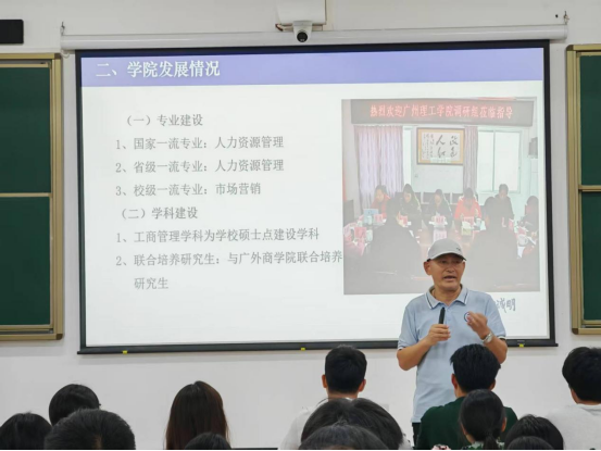 “咱们学院的教学研究成果一直很亮眼” ,他抬手轻指着 PPT 上的数据,语气里满是自豪,“日常学习生活里,大家要多主动去了解学院的专业实力—— 人力资源管理专业,既是国家级一流专业,也是省级一流专业,是咱们的‘王牌’;市场营销专业是校级一流专业,同样潜力十足。”“我们还拥有7项省级教改项目沉淀着前沿教学理念,32项校级教改项目搭建起扎实的知识框架,还有许多个实践教学基地为大家提供动手实操的平台——这些宝贵资源,都等着大家去探索、去利用。”他鼓励同学们主动走进这些优质课程的课堂,在实践基地的真实场景里锤炼技能,让知识真正“活”起来。