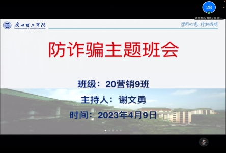 (陈逸杰)4月9日晚19点,威廉希尔williamhill中文全体班级召开“防范电信网络诈骗知识”线上主题班会,以进一步加强学生防诈骗安全教育,提高同学们防范、识别电信网络诈骗意识,维护人身财产安全,提升自我保护能力。