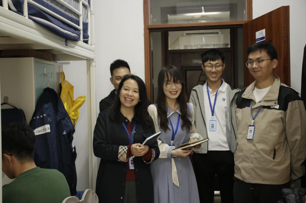 在惠州校区辅导员尚筱敏、张帅的带领下,杨惠书记与老师们一同前往学生宿舍,开展新学期查寝工作,了解他们的寝室生活。在走访宿舍的过程中,杨惠书记提醒同学们加强寝室清洁管理,保持宿舍环境卫生,宿舍内禁止使用大功率电器,并且在平常住宿生活中务必注意财产安全、用电安全和人身安全,谨防诈骗;并向同学们寄语要劳逸结合,关注身体健康与心理健康,鼓励同学们要以更加饱满的心态去面对新学期的学习和生活。