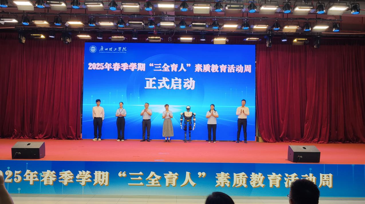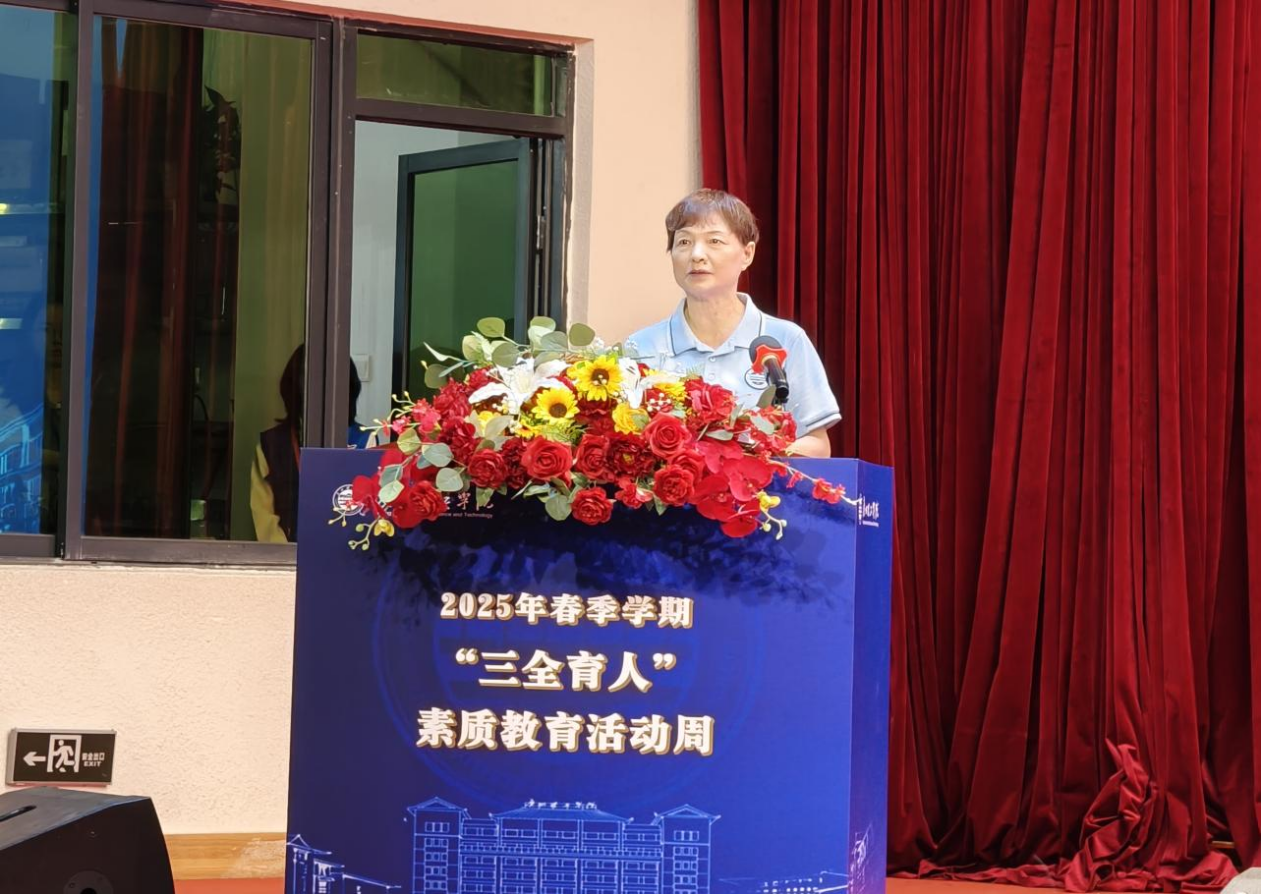 接下来,张世梅副校长作活动致辞。她强调素质教育周以科技为主题,要求全体师生促进学科交叉融合,激发科研兴趣,同时要求全校教职工积极推动学生德智体美劳全面发展。在本次启动仪式上,我校学生自主研发的机器人与校领导共同完成剪彩仪式。这提醒着我们:科技的未来需要每一位同学去书写。最后,张世梅校长预祝“三全育人”素质教育周取得圆满成功。