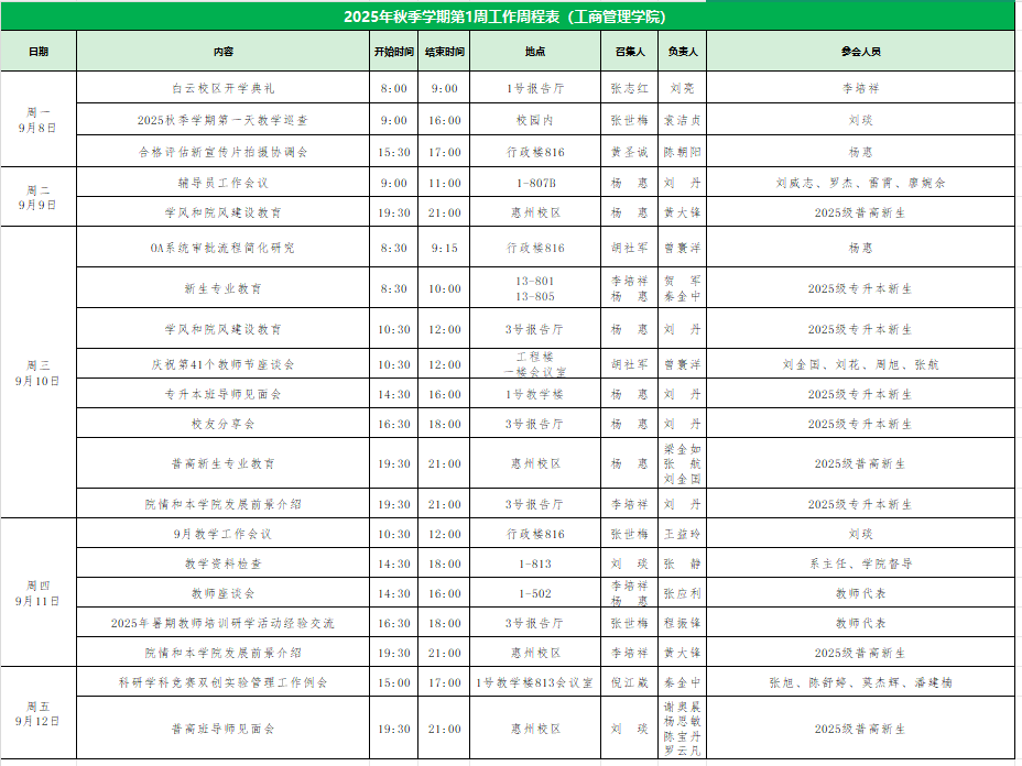 威廉希尔williamhill中文2025年秋季学期第1周工作周程表