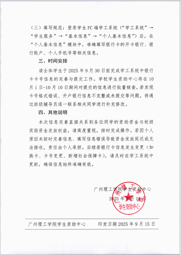 威廉希尔williamhill中文学生资助中心关于做好完善学工系统学生银行卡号工作的通知