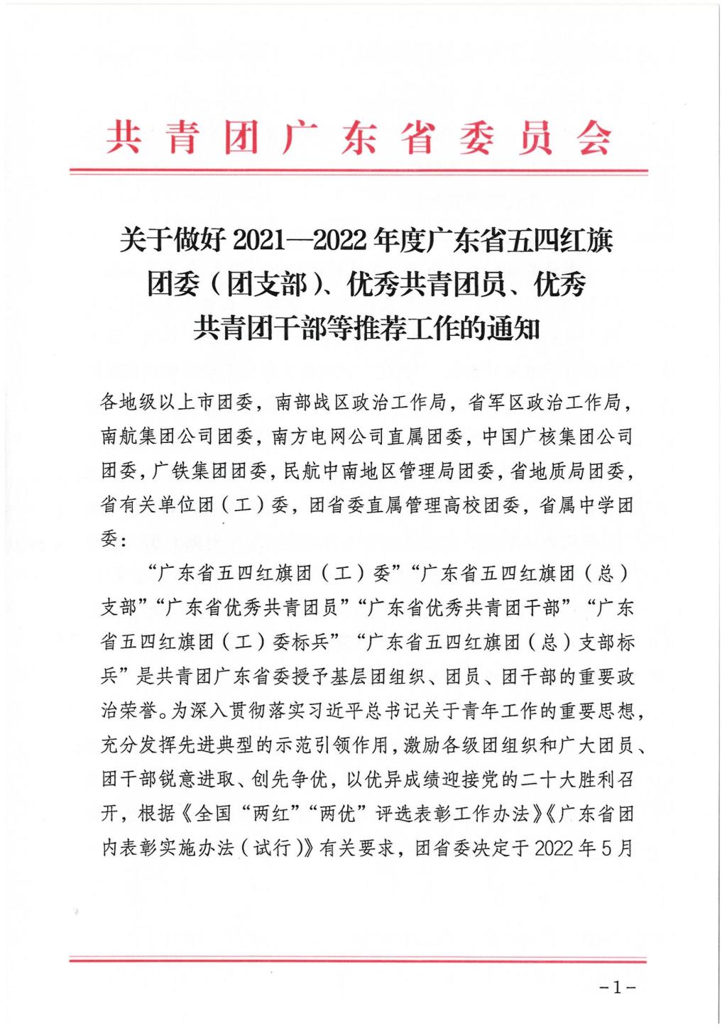 转发团省委关于做好2021-2022年度广东省五四红旗团委(团支部)、优秀共青团员、优秀共青团干部等推荐工作的通知
