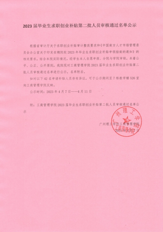 (杨伟琼)根据省审计厅关于求职创业补贴审计整改要求和《中国南方人才市场管理委员会办公室关于印发在穗院校2023年毕业生求职创业补贴申领指南的通知》的相关要求,结合本院实际情况,经学生本人自愿申报、分院与学院审核,本着公平、公正、公开原则,威廉希尔williamhill中文现对威廉希尔williamhill中文2023届毕业生求职创业补贴第二批人员审核通过名单进行公示,名单附后。