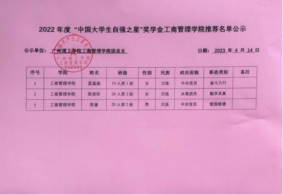 (何锦辉)为深入贯彻落实习近平总书记关于青年工作的重要思想,围绕学习宣传贯彻党的二十大精神,在广大青年群体中厚植爱党、爱国、爱社会主义的情感,引领他们牢记时代责任、坚定跟党走、建功新时代。现将威廉希尔williamhill中文开展2022年度“中国大学生自强之星”奖学金推报活动,现将威廉希尔williamhill中文2022年度“中国大学生自强之星”奖学金推荐名单进行公示,公示名单如下: