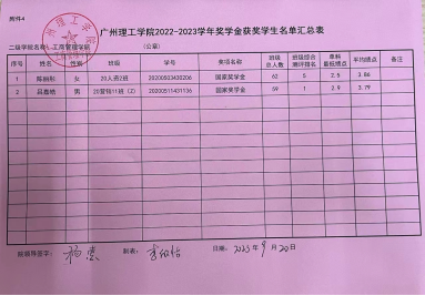 根据《威廉希尔williamhill中文学生处关于印发《2022-2023学年奖学金评比工作方案》的通知》(广州理工学函〔2023〕182号):由本人提出申请,威廉希尔williamhill中文对符合要求的国家奖学金申请材料进行审查,确定陈丽彤、吕嘉皓两位同学为威廉希尔williamhill中文国家奖学金候选人,并予以公示,公示期2023年9月20日-9月22日。如对评定结果有异议,请在公示时间内向李欣怡或杨惠书记进行实名反映。办公地点:李欣怡--7栋526、杨惠--7栋520。