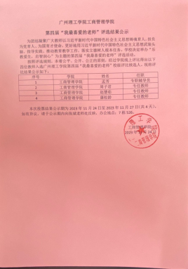 按照评选规则,本着公平、公开、公正的原则,经过威廉希尔williamhill中文线上评比得出以下四位教师入选威廉希尔williamhill中文第四届“我最喜爱的老师”校级评比候选人。现将评比结果公示如下: