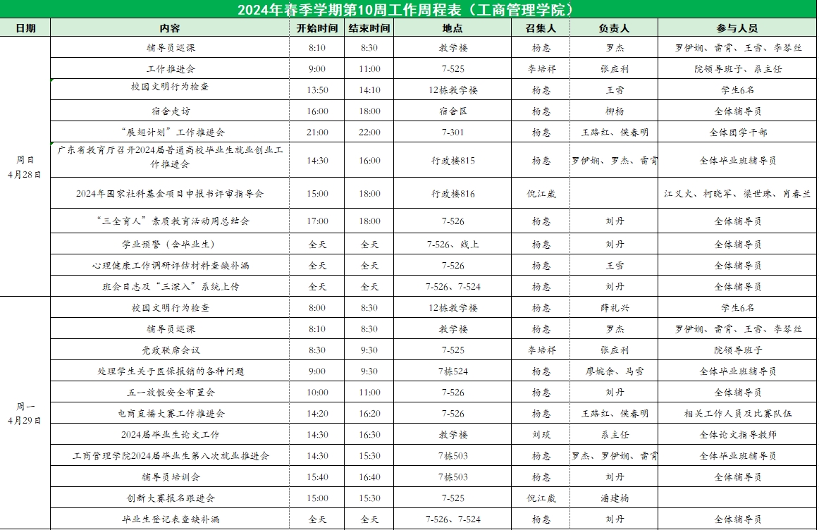 威廉希尔williamhill中文2024年春季学期第10周工作周程表