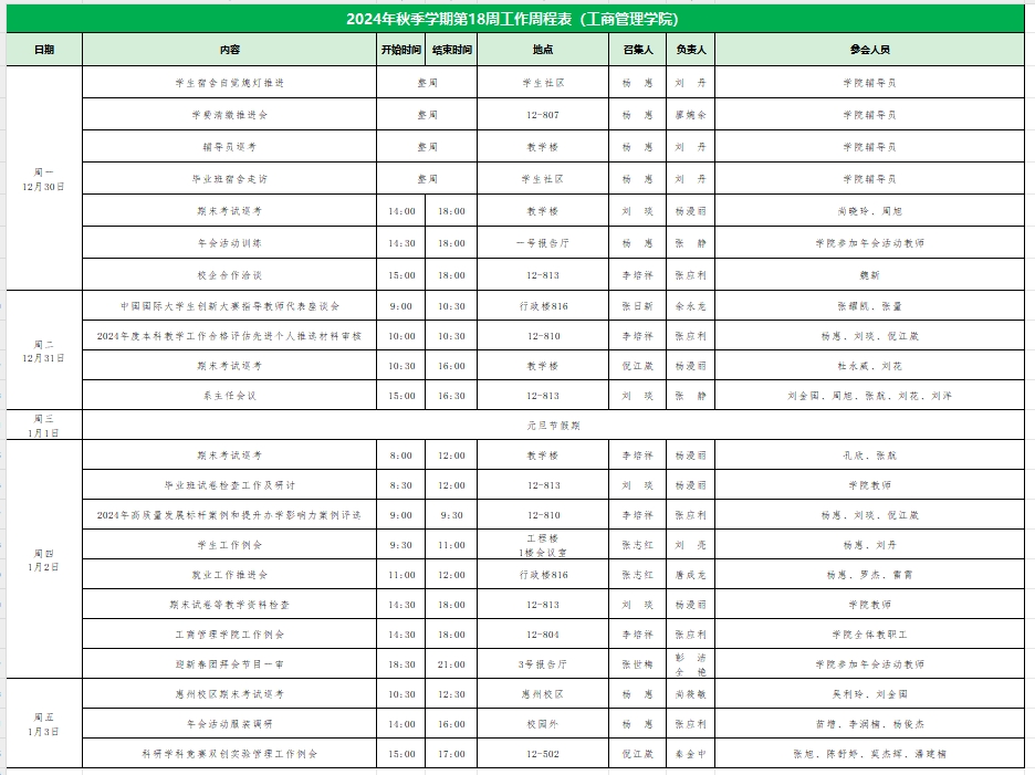 威廉希尔williamhill中文2024年秋季学期第18周工作周程表